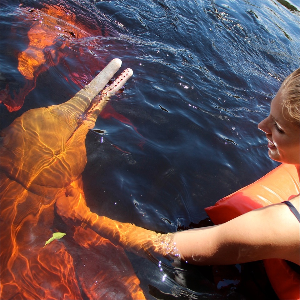 Wir haben es geschafft! Wir haben tatsächlich in 90 Tagen 90 Tiere ausfindig gemacht und sie Euch vorgestellt. Gestartet sind wir in den USA, um dann über Kolumbien nach Ecuador zu den Galapagos Inseln und zum Äquator zu reisen. Weiter ging es mit Chile und der Atacama Wüste über Buenos Aires zu den Pinguinen auf der Peninsula Valdez in Argentinien. Von dort aus haben wir uns auf den Weg zum Karneval in Rio gemacht, wo wir Fernanda Brandao trafen. Dann ging es nach Florianopolis, Pomerode, Brasilia und Manaus. Wir haben von den Wüsten über die Tropen bis hin zur Steppe und der hohen Andenregion Insekten, tropische Vögel und sogar Pinguine in freier Wildbahn gesehen. Während der Suche nach den Tieren haben wir Schulfilme über den Kaffeeanbau in Kolumbien, Darwinismus auf Galapagos, den Massentourismus in der Wüste und die Landeskunde Brasiliens gedreht. Und was wir Euch heute als absolutes Highlight unserer Tour vorstellen dürfen, sind pinke Delfine. Ja, es gibt tatsächlich pinke Delfine auf dieser Erde, und zwar im Amazonas. Dem Schwimmen mit ihnen sagt man heilende Kräfte nach. Obwohl wir wissen, dass direkt neben diesen pinken Delfinen mindestens Piranhas und Kaimane hin und her flitzen, trauen wir uns ins schwarze Wasser des Rio Nero. Und mit diesen beeindruckenden Tieren verabschiede ich mich von Euch und hoffe, die Reise zu 90-mal skurrilen, mal beeindruckenden oder einfach nur schönen Momenten mit Mensch und Natur hat Euch gefallen. Ich freue mich sehr über alle, die unsere Reise verfolgt haben. Wir vom Schlaumeier TV-Team freuen uns schon jetzt auf neue Abenteuer und hoffen, Ihr seid dann wieder mit dabei! Eure Martina, alias Frau Schlaumeier.