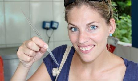 Die Lagune in Florianopolis ist eine wahre Fundgrube für unsere Serie der 90 Tiere in 90 Tagen, die wir begleitend zu unserem Lehrfilm über Brasilien jeden Tag vorstellen. Bei dem Fischer, der gestern 800 Kilo Gambas bekommen hat, sind heute Tintenfische angekommen. Auch die Tintenfische sind in großer Menge gefangen worden und werden für den Verzehr vorbereitet. Und während ich die Köche dabei beobachte, fällt es mir sprichwörtlich wie Schuppen von den Augen, warum Tintenfische Tintenfische heißen: Sie haben jede Menge Tinte in ihrem Körper! Die Köche nehmen bei jedem Tintenfisch eine Art Blase aus dem Körper, die gefüllt ist mit schwarz-blauer Tinte. Diese drücken sie aus, um den mehrarmigen Oktopus weiterverarbeiten zu können. Noch mehr erstaunt es mich, dass das Tier nicht nur Tinte zu bieten hat, sondern auch einen Füllfederhalter, den mir der Koch in die Hand gibt – es handelt sich um einen Knochen des Oktopus. Der Tintenfisch bietet somit ein komplettes Schreibset. Mal wieder bin ich erstaunt, was Mutter Natur sich ausgedacht hat.