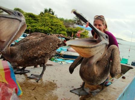 Wir haben auf unserer Reise durch Südamerika nicht nur viele Tiere getroffen, sondern auch jede Menge nette Menschen. Leute aus Kolumbien, den USA, Ecuador, Argentinien und Brasilien waren dabei. Dank E-Mail können wir Kontakt zueinanderhalten – und da passiert es, dass wir von einem neuen Freund Post bekommen per E-Mail: Fotos von mir, auf den Galapagos Inseln. Ihr habt ja schon einige von den Bildern gesehen – doch diese wollen wir euch nicht vorenthalten: Es handelt sich um Bilder, die früh morgens bei den Fischern aufgenommen wurden. Nachdem die Fischer fischen waren, haben sie den Fisch ausgenommen und verkauft – und da das anscheinend jeden morgen passiert, wissen diese klugen Pelikane Bescheid. Sie kommen hierhin,